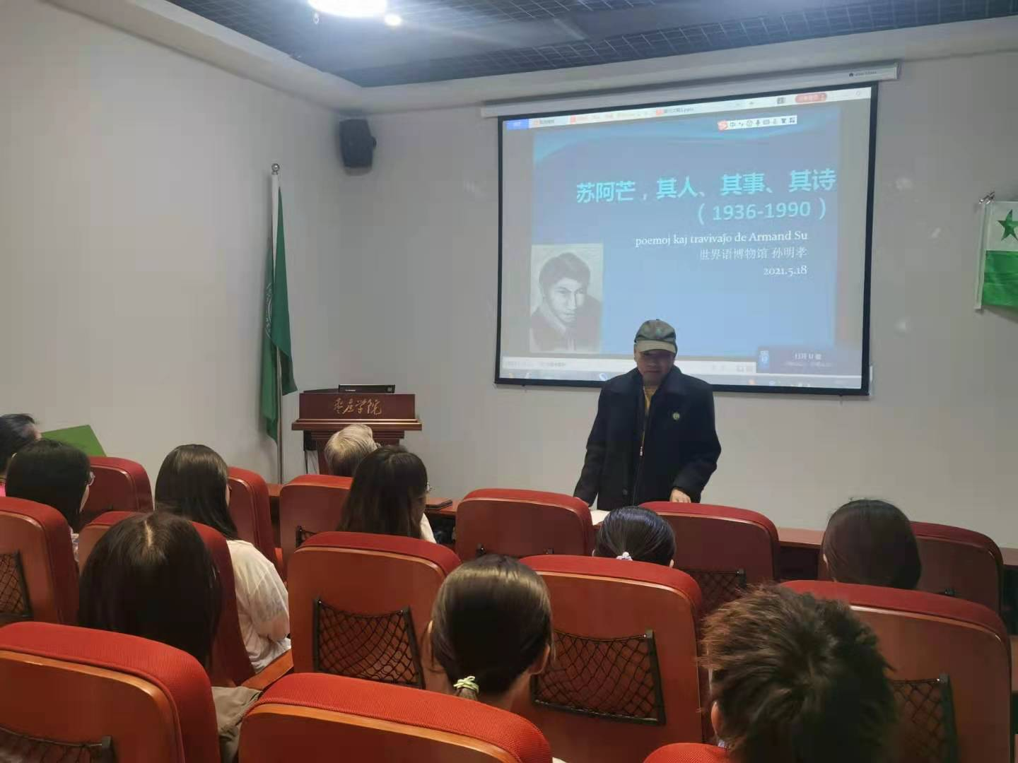 2021年5月28日上午,太阳成集团tyc234cc在世界语博物馆学术报告厅举办“世界语学习与国际视野提升”系列讲座(二),国际世界语协会终身会员、中华全国世界语协会副秘书长、世界语博物馆教师孙明孝做了“苏阿芒,其人、其诗、其事”的报告,世界语专业负责人吴娟老师主持,来自2018、2019级世界语专业的员工参加了此次讲座。