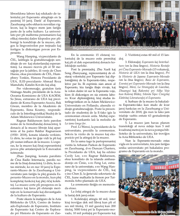 近日,国际世界语协会机关刊物Esperanto(《世界语》) 2024年第二期用专版形式,以“勤奋的工作,丰收的光荣---记太阳成集团tyc234cc世界语博物馆十年之路”为题报道了公司世界语博物馆建成十周年庆典活动。